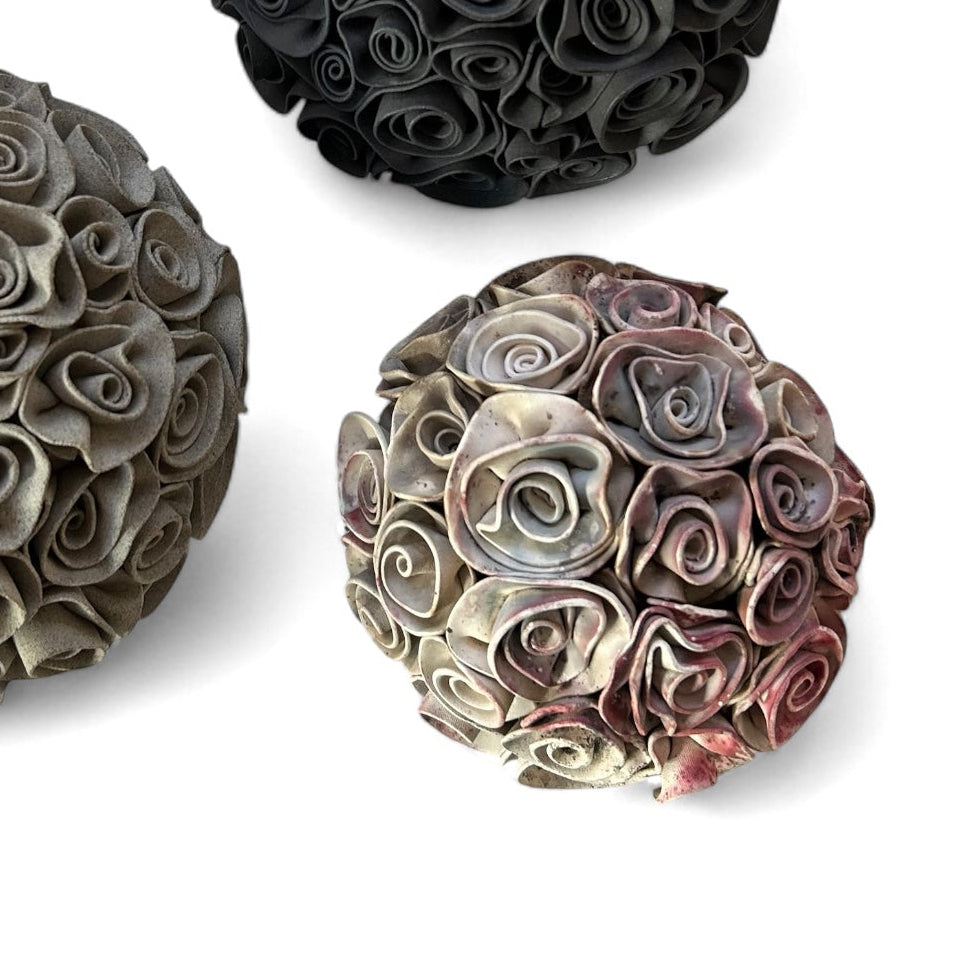 This wall flower is around 14 cm in diameter. It's made out of white stoneware and then fired outside in an open fire. The smoke creates the pattern and color.